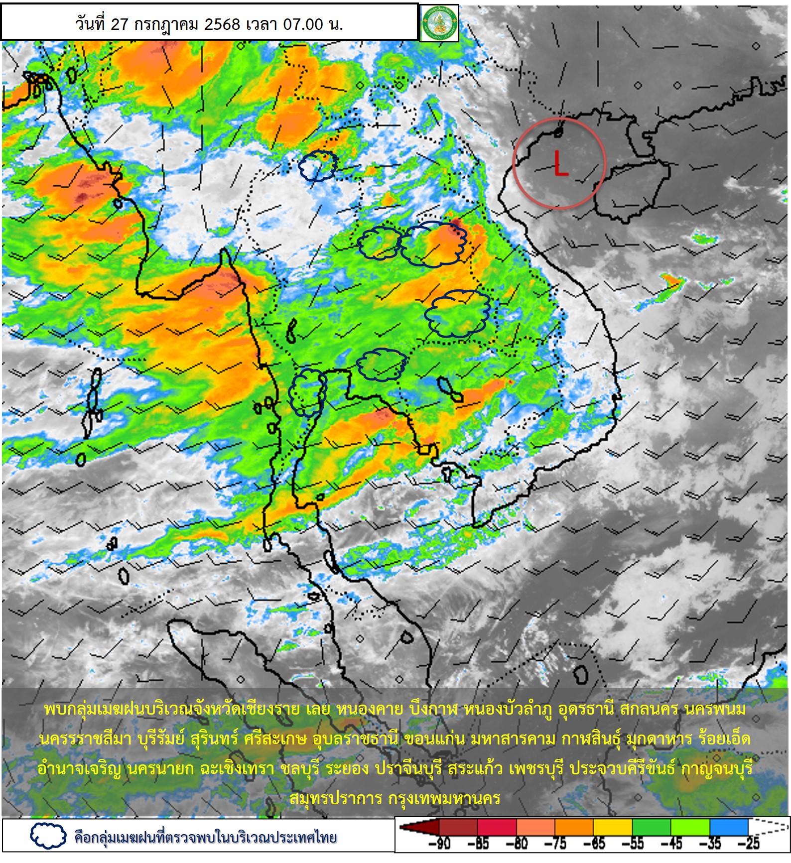 ลักษณะอากาศทั่วไป : พยากรณ์อากาศ 24 ชั่วโมงข้างหน้า ประเทศไทยตอนบนยังคงมีฝนตกหนักบางแห่ง และมีฝนตกหนักมากบางพื้นที่ในภาคเหนือและภาคตะวันออกเฉียงเหนือ โดยเฉพาะบริเวณจังหวัดเชียงราย พะเยา น่าน หนองคาย บึงกาฬ อุดรธานี สกลนคร และนครพนม ขอให้ประชาชนในบริเวณดังกล่าวระวังอันตรายจากฝนตกหนักถึงหนักมากและฝนที่ตกสะสมซึ่งอาจทำให้เกิดน้ำท่วมฉับพลัน น้ำป่าไหลหลาก และน้ำล้นตลิ่ง โดยเฉพาะพื้นที่ลาดเชิงเขาใกล้ทางน้ำไหลผ่านและพื้นที่ลุ่ม ทั้งนี้เนื่องจากมรสุมตะวันตกเฉียงใต้กำลังปานกลางพัดปกคลุมทะเลอันดามัน ประเทศไทย และอ่าวไทย ประกอบกับมีหย่อมความกดอากาศต่ำปกคลุมบริเวณชายฝั่งประเทศเวียดนามตอนบน และอ่าวตังเกี๋ย สำหรับคลื่นลมบริเวณทะเลอันดามันตอนบน และอ่าวไทยตอนบนมีกำลังปานกลาง โดยมีคลื่นสูงประมาณ 2 เมตร บริเวณที่มีฝนฟ้าคะนองคลื่นสูงมากกว่า 2 เมตร ส่วนทะเลอันดามันตอนล่างมีคลื่นสูง 1 - 2 เมตร บริเวณที่มีฝนฟ้าคะนองคลื่นสูงมากกว่า 2 เมตร ขอให้ชาวเรือบริเวณทะเลอันดามันและอ่าวไทยเดินเรือด้วยความระมัดระวังและหลีกเลี่ยงการเดินเรือในบริเวณที่มีฝนฟ้าคะนอง