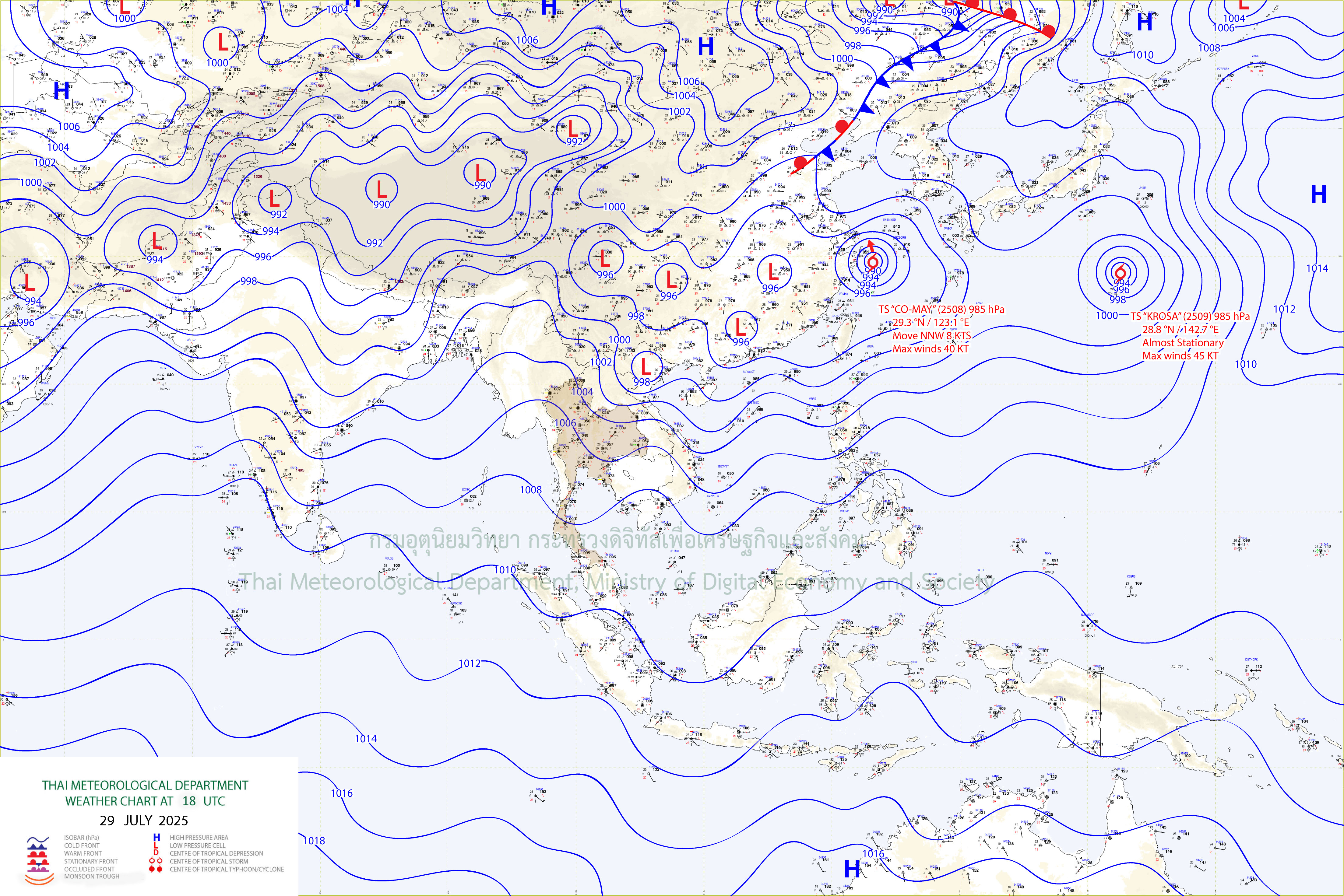 สำหรับคลื่นลมบริเวณทะเลอันดามันตอนบน และอ่าวไทยตอนบนมีกำลังปานกลาง โดยมีคลื่นสูงประมาณ 2 เมตร บริเวณที่มีฝนฟ้าคะนองคลื่นสูงมากกว่า 2 เมตร ส่วนทะเลอันดามันตอนล่างมีคลื่นสูง 1-2 เมตร บริเวณที่มีฝนฟ้าคะนองคลื่นสูงมากกว่า 2 เมตร ขอให้ชาวเรือบริเวณทะเลอันดามันและอ่าวไทยเดินเรือด้วยความระมัดระวังและหลีกเลี่ยงการเดินเรือในบริเวณที่มีฝนฟ้าคะนอง