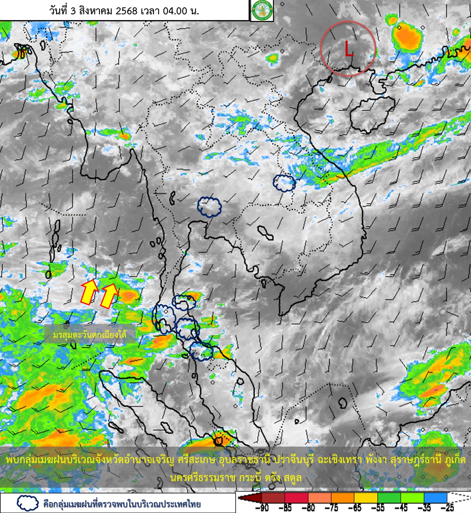 ลักษณะอากาศทั่วไป : พยากรณ์อากาศ 24 ชั่วโมงข้างหน้า ประเทศไทยตอนบนมีฝนน้อยเนื่องจากมรสุมตะวันตกเฉียงใต้กำลังอ่อนพัดปกคลุมทะเลอันดามัน ประเทศไทย และอ่าวไทย ในขณะที่มีหย่อมความกดอากาศต่ำปกคลุมบริเวณประเทศเวียดนามตอนบนและอ่าวตังเกี๋ย