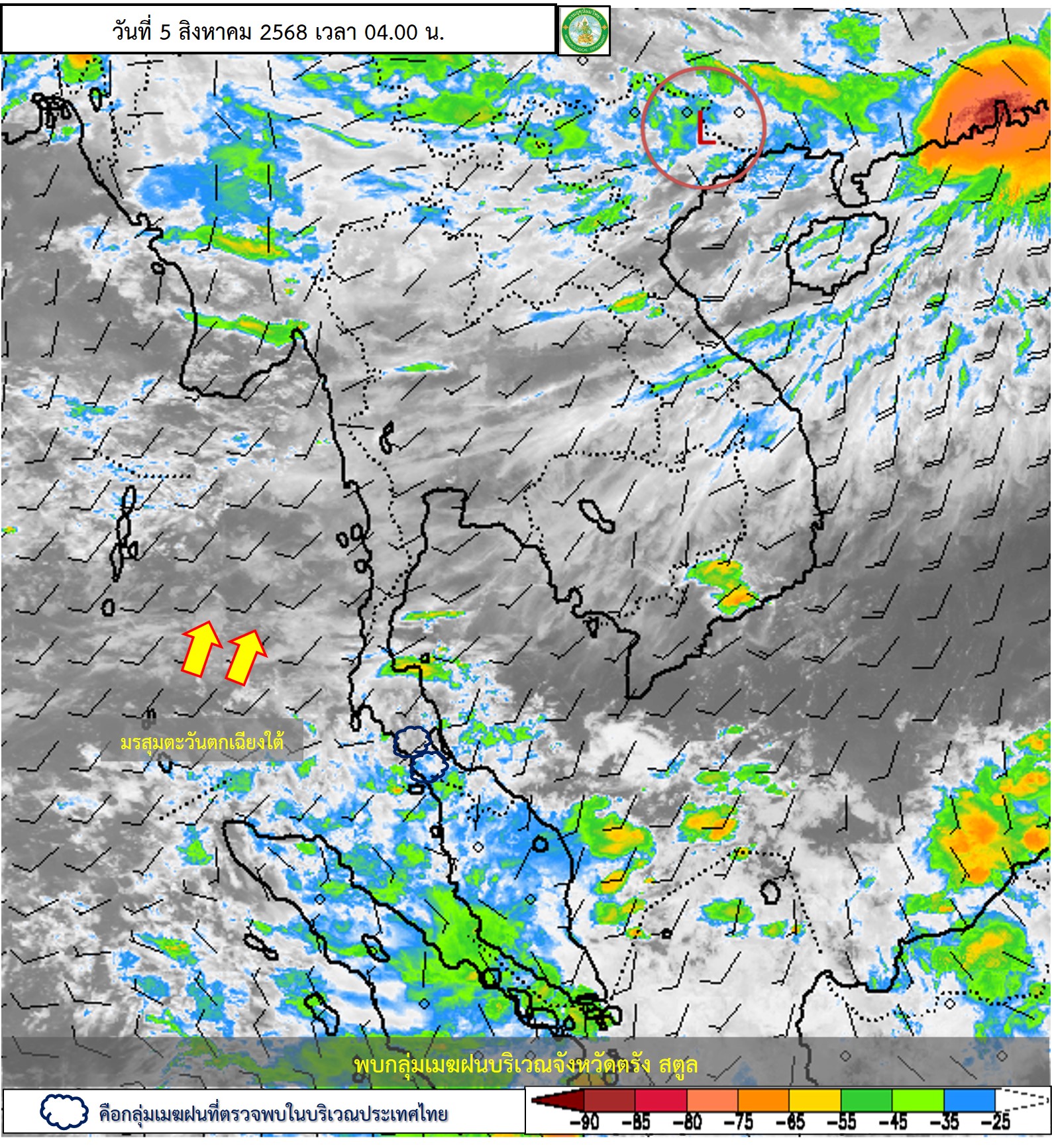 ลักษณะอากาศทั่วไป : พยากรณ์อากาศ 24 ชั่วโมงข้างหน้า ประเทศไทยตอนบนมีฝนฟ้าคะนองบางแห่ง เนื่องจากมรสุมตะวันตกเฉียงใต้กำลังอ่อนยังคงพัดปกคลุมทะเลอันดามัน ประเทศไทย และอ่าวไทย ในขณะที่มีหย่อมความกดอากาศต่ำปกคลุมบริเวณประเทศเวียดนามตอนบน สำหรับคลื่นลมบริเวณทะเลอันดามันและอ่าวไทยมีกำลังปานกลาง โดยบริเวณทะเลอันดามันตอนบนมีคลื่นสูง 1-2 เมตร บริเวณที่มีฝนฟ้าคะนองคลื่นสูงมากกว่า 2 เมตร ขอให้ชาวเรือบริเวณทะเลอันดามันและอ่าวไทยเดินเรือด้วยความระมัดระวัง และหลีกเลี่ยงการเดินเรือในบริเวณที่มีฝนฟ้าคะนอง