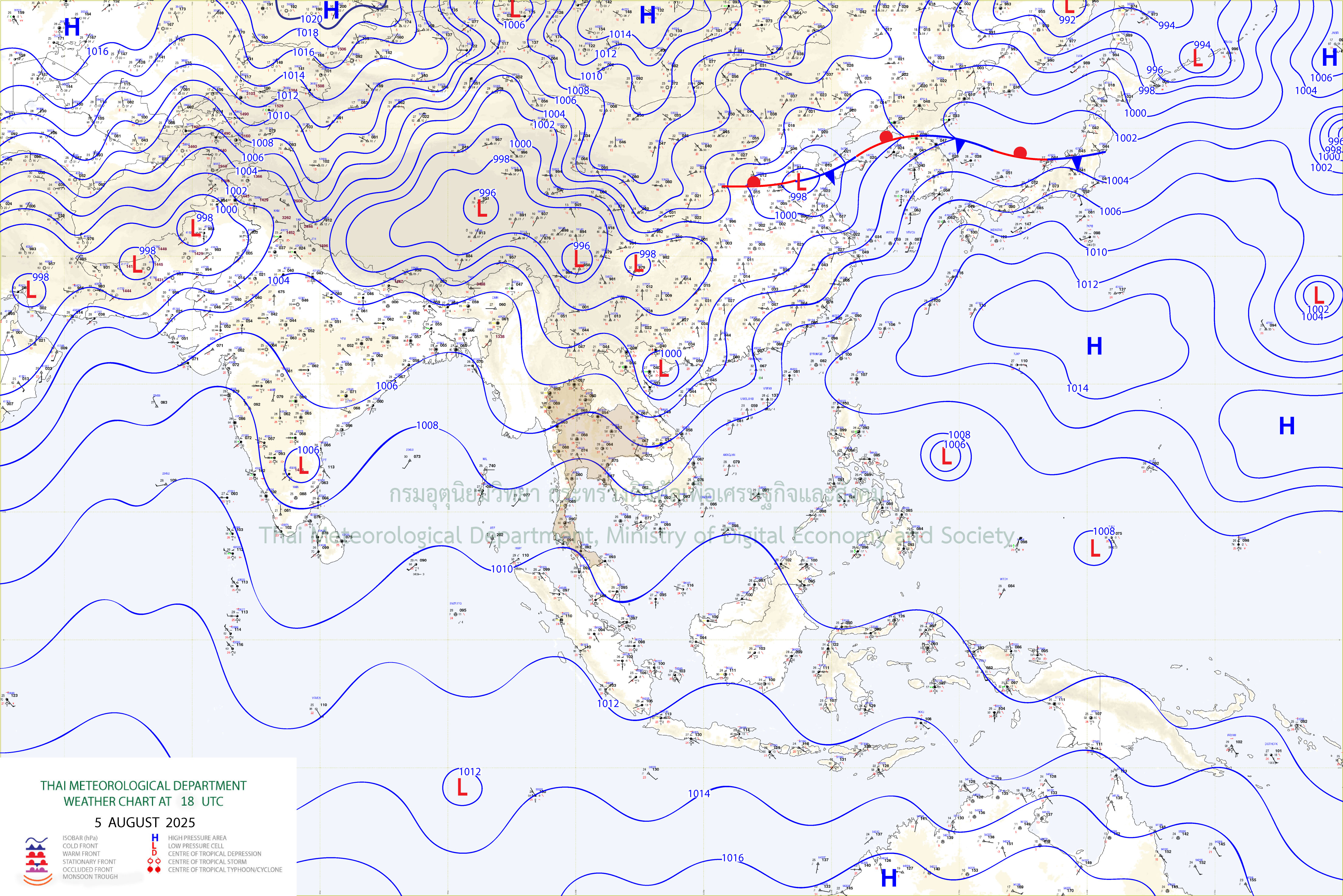 ลักษณะอากาศทั่วไป : พยากรณ์อากาศ 24 ชั่วโมงข้างหน้า ประเทศไทยตอนบนมีฝนฟ้าคะนองกับมีลมกระโชกแรงบางแห่ง โดยมีฝนตกหนักบางพื้นที่ในบริเวณจังหวัดแม่ฮ่องสอน เชียงใหม่ เชียงราย ลำปาง พะเยา น่าน หนองคาย บึงกาฬ นครพนม สุราษฎร์ธานี นครศรีธรรมราช สงขลา ปัตตานี ยะลา นราธิวาส ระนอง พังงา ตรัง และสตูล ขอให้ประชาชนในบริเวณดังกล่าวระวังอันตรายจากฝนฟ้าคะนอง ลมกระโชกแรง และฝนตกหนักที่อาจจะเกิดขึ้นไว้ด้วย เนื่องจากมีหย่อมความกดอากาศต่ำปกคลุมบริเวณประเทศเวียดนามตอนบน ประกอบกับมรสุมตะวันตกเฉียงใต้ยังคงพัดปกคลุมทะเลอันดามัน ประเทศไทย และอ่าวไทย สำหรับคลื่นลมบริเวณทะเลอันดามันตอนบนมีกำลังปานกลาง โดยมีคลื่นสูง 1-2 เมตร บริเวณที่มีฝนฟ้าคะนองคลื่นสูงมากกว่า 2 เมตร ขอให้ชาวเรือบริเวณทะเลอันดามันและอ่าวไทยเดินเรือด้วยความระมัดระวัง และหลีกเลี่ยงการเดินเรือในบริเวณที่มีฝนฟ้าคะนอง