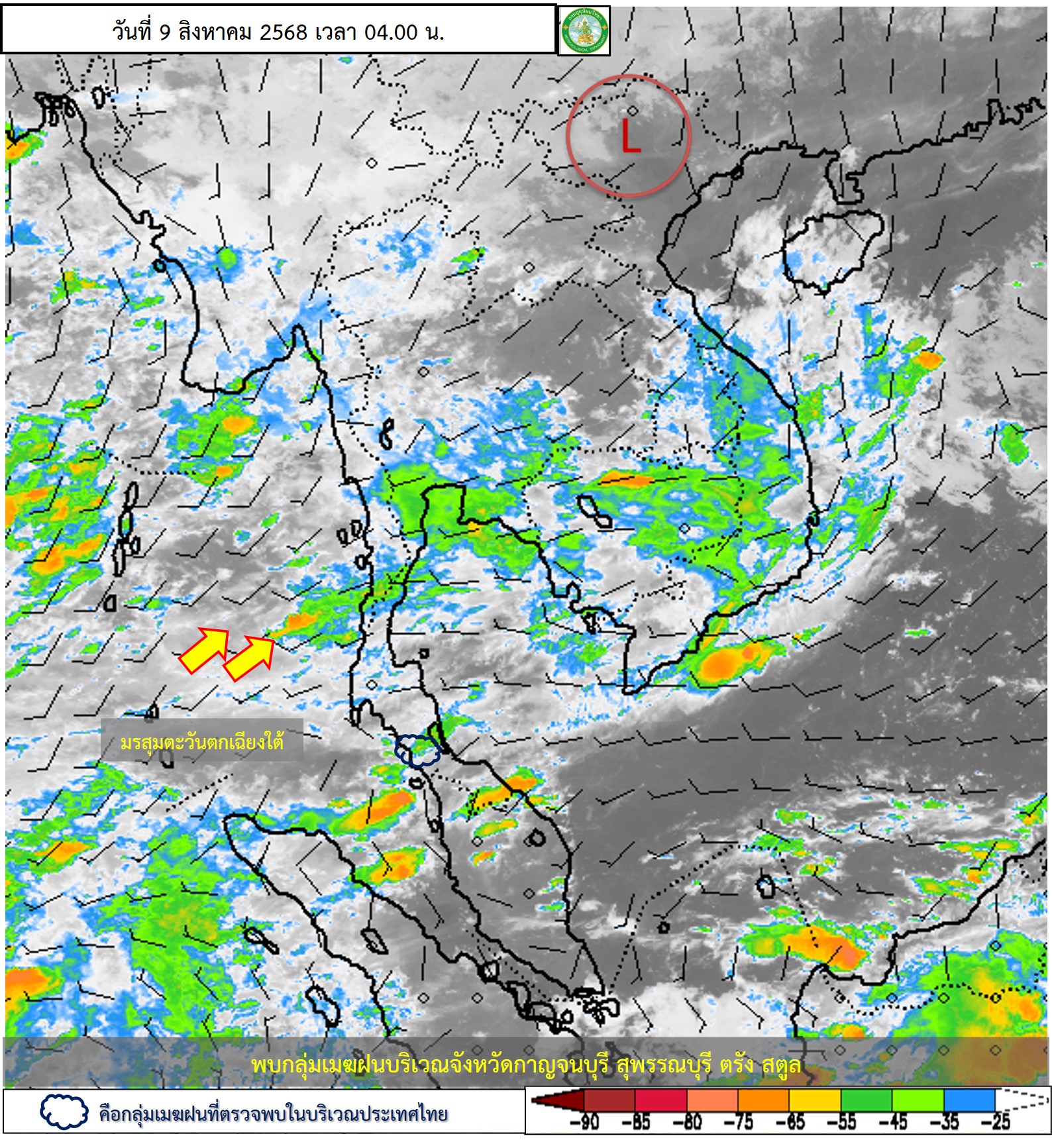 ลักษณะอากาศทั่วไป : พยากรณ์อากาศ 24 ชั่วโมงข้างหน้า ประเทศไทยยังคงมีฝนฟ้าคะนองเกิดขึ้นได้ในบางพื้นที่ ขอให้ประชาชนระวังอันตรายจากฝนฟ้าคะนองไว้ด้วย เนื่องจากมรสุมตะวันตกเฉียงใต้พัดปกคลุมทะเลอันดามัน ประเทศไทย และอ่าวไทย สำหรับคลื่นลมบริเวณทะเลอันดามันตอนบนมีกำลังปานกลาง โดยมีคลื่นสูง 1-2 เมตร บริเวณที่มีฝนฟ้าคะนองคลื่นสูงมากกว่า 2 เมตร ขอให้ชาวเรือบริเวณทะเลอันดามันและอ่าวไทยเดินเรือด้วยความระมัดระวัง และหลีกเลี่ยงการเดินเรือในบริเวณที่มีฝนฟ้าคะนองไว้ด้วย อนึ่ง ในช่วงวันที่ 10 - 15 ส.ค. ประเทศไทยจะมีฝนเพิ่มขึ้น และมีฝนตกหนักบางแห่ง โดยมีฝนตกหนักมากบางพื้นที่ในภาคตะวันออก และภาคใต้ฝั่งตะวันตก เนื่องจากจะมีร่องมรสุมพาดผ่านภาคเหนือ และภาคตะวันออกเฉียงเหนือ ประกอบกับมรสุมตะวันตกเฉียงใต้ที่พัดปกคลุมทะเลอันดามัน ประเทศไทย และอ่าวไทยจะมีกำลังแรงขึ้น