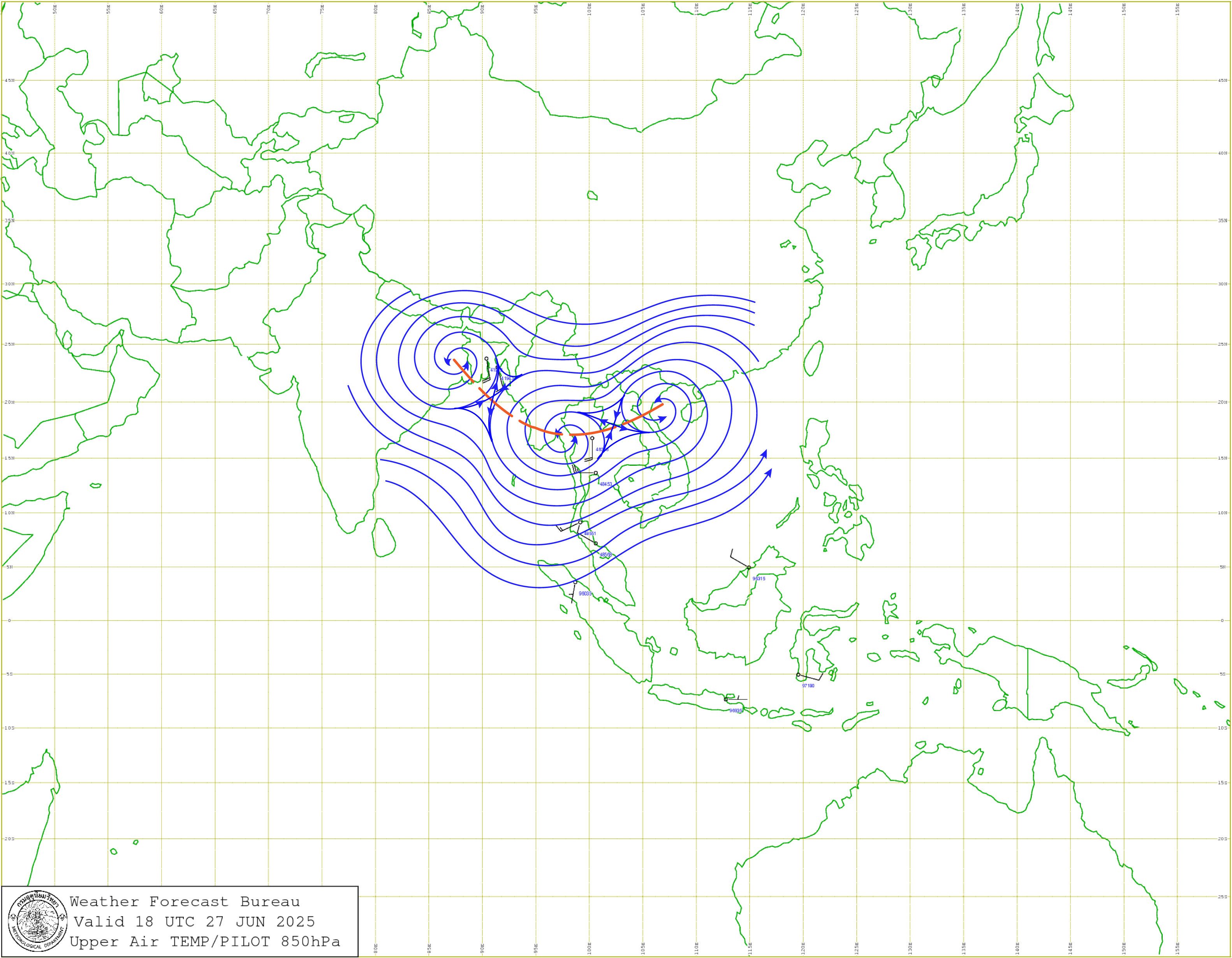 ลักษณะอากาศทั่วไป : พยากรณ์อากาศ 24 ชั่วโมงข้างหน้า ภาคเหนือและภาคตะวันออกเฉียงเหนือมีฝนตกหนักถึงหนักมากบางพื้นที่ ภาคกลางรวมทั้งกรุงเทพมหานครและปริมณฑลและภาคตะวันออกมีฝนตกหนักบางแห่ง ส่วนภาคใต้มีฝนฟ้าคะนองบางพื้นที่ ขอให้ประชาชนบริเวณภาคเหนือบริเวณจังหวัดเชียงรายและน่าน และภาคตะวันออกเฉียงเหนือระวังอันตรายจากฝนตกหนักและฝนที่ตกสะสม ซึ่งอาจทำให้เกิดน้ำท่วมฉับพลันและน้ำป่าไหลหลาก โดยเฉพาะพื้นที่ลาดเชิงเขาใกล้ทางน้ำไหลผ่านและพื้นที่ลุ่ม ทั้งนี้เนื่องจากร่องมรสุมพาดผ่านประเทศเมียนมาตอนบน และตอนบนของภาคเหนือ เข้าสู่หย่อมความกดอากาศต่ำบริเวณประเทศลาวตอนบนและประเทศเวียดนามตอนบน ประกอบกับมรสุมตะวันตกเฉียงใต้ที่พัดปกคลุมทะเลอันดามัน ประเทศไทย และอ่าวไทยมีกำลังปานกลาง