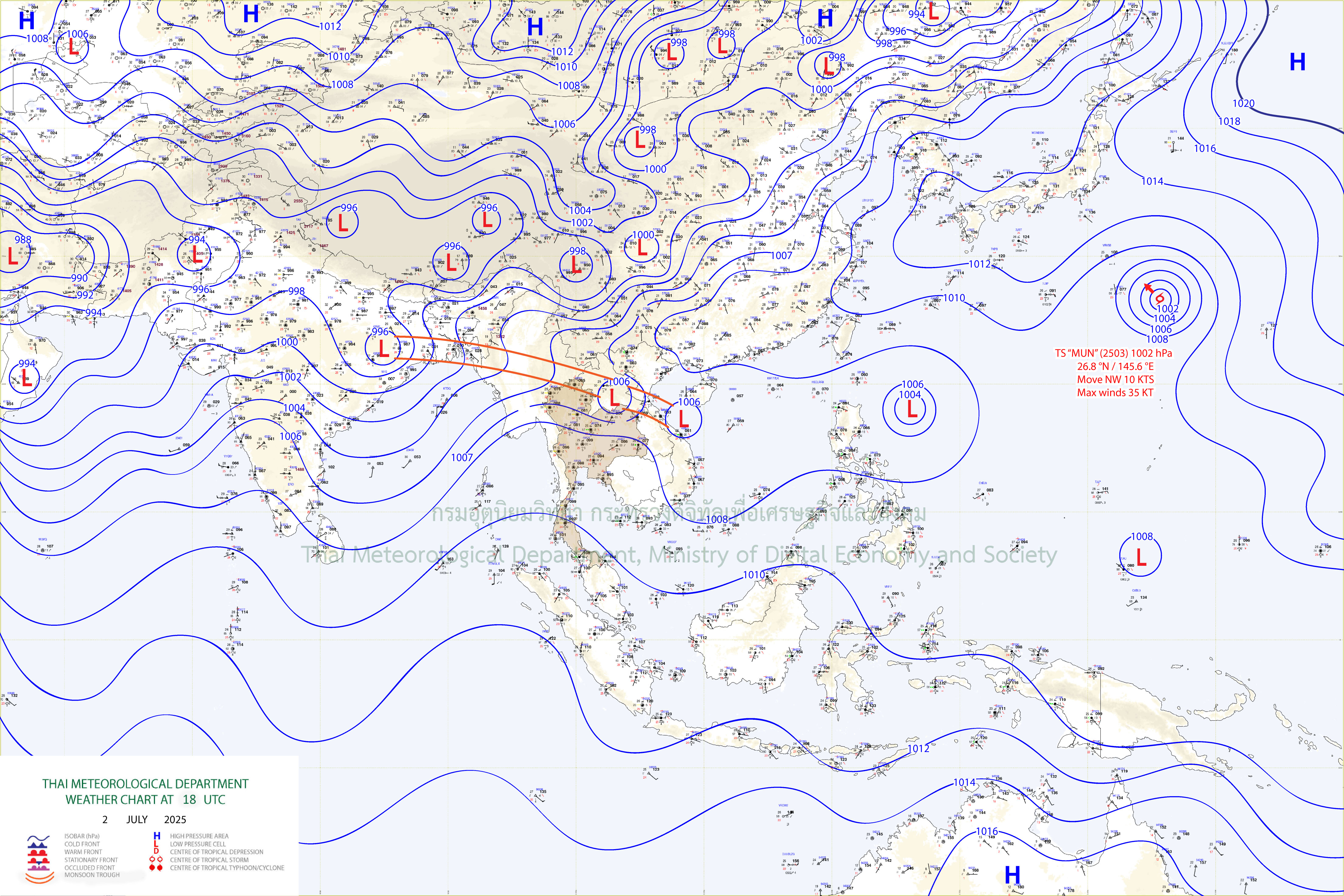 ลักษณะอากาศทั่วไป : พยากรณ์อากาศ 24 ชั่วโมงข้างหน้า บริเวณประเทศไทยมีฝนตกหนักบางแห่ง โดยมีฝนตกหนักมากบางพื้นที่ในภาคเหนือ ภาคตะวันออกเฉียงเหนือตอนบน และภาคตะวันออก ขอให้ประชาชนในบริเวณดังกล่าว โดยเฉพาะบริเวณจังหวัดต่างๆ ตามที่ระบุไว้ในรายภาค ระวังอันตรายจากฝนตกหนักถึงหนักมากและฝนที่ตกสะสม ซึ่งอาจทำให้เกิดน้ำท่วมฉับพลัน น้ำป่าไหลหลากและดินโคลนถล่ม โดยเฉพาะพื้นที่ลาดเชิงเขาใกล้ทางน้ำไหลผ่านและพื้นที่ลุ่ม ทั้งนี้เนื่องจากร่องมรสุมกำลังค่อนข้างแรงพาดผ่านภาคเหนือตอนบนและภาคตะวันออกเฉียงเหนือตอนบน เข้าสู่หย่อมความกดอากาศต่ำบริเวณประเทศลาวตอนล่างและเวียดนามตอนกลาง ประกอบกับมรสุมตะวันตกเฉียงใต้กำลังปานกลางยังคงพัดปกคลุมทะเลอันดามัน ประเทศไทย และอ่าวไทย สำหรับคลื่นลมบริเวณทะเลอันดามันและอ่าวไทยมีกำลังปานกลาง โดยทะเลอันดามันตอนบนมีคลื่นสูงประมาณ 2 เมตร ส่วนทะเลอันดามันตอนล่างและอ่าวไทยตอนบนมีคลื่นสูง 1-2 เมตร บริเวณที่มีฝนฟ้าคะนองคลื่นสูงมากกว่า 2 เมตร ขอให้ชาวเรือบริเวณทะเลอันดามันและอ่าวไทยเดินเรือด้วยความระมัดระวัง และหลีกเลี่ยงการเดินเรือในบริเวณที่มีฝนฟ้าคะนองไว้ด้วย